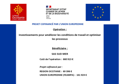 SUD MER vient de terminer un projet, qui a duré 2 ans, d’investissements pour améliorer les conditions de travail et optimiser les process. Ces investissements ont coûté près de 700 000 euros HT. Ils ont obtenu, pour 35 % de l'enveloppe totale, l'appui financier de l'Europe (programme FEAMPA) de la Région Occitanie.